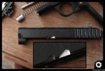 Le GBB est shortstroké pour les besoins du custom, c’est à dire que la culasse recule moins que sur le TT33 d’origine. Ainsi le creux sur la culasse permettant à celle-ci d’être accrochée par l’arrêtoir ne recule pas assez pour permettre un crochetage de la culasse quand le chargeur est vide. Il faut donc en refaire un plus en arrière. Culasse montée dans un étaux placé sous la perceuse à colonne, une petite fraise de 2mm à 1$ fdp in et le tour est joué !