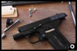 img_9373mod2 – Encore un tout petit peu de métal avec une modification des vis. Raccourcies à la meuleuse pour ne pas dépasser dans le puits de chargeur et tête retravaillée sur la perceuse à colonne pour obtenir un effet bombé.