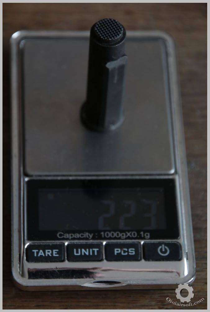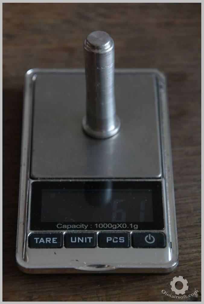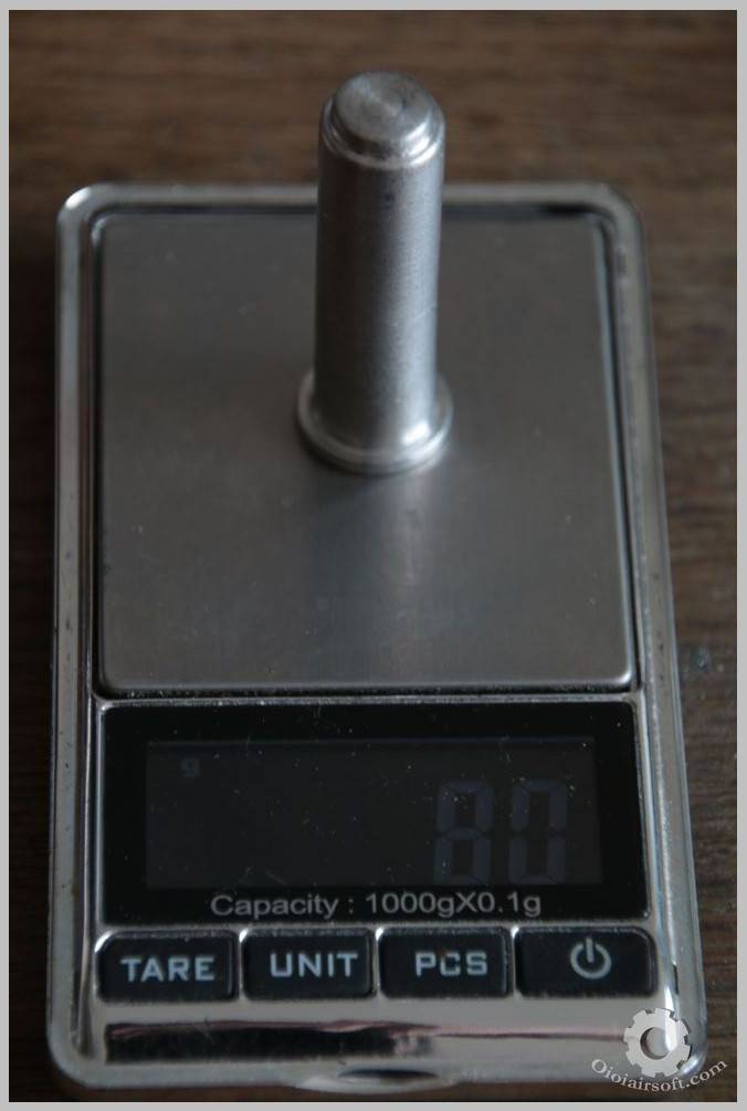 Dans les répliques classiques telles qu’on les achètes, le spring guide plug est en zamak. Sa densité est d’environ 7g/cm^3, ce qui est proche de la densité de l’acier : 7.5g/cm^3. Ces deux matériaux sont lourds et c’est pourtant dans ces matières qu’on trouve la plupart des spring guide plug du commerce. En spare on trouvera surtout de l’acier. Le mieux reste encore l’aluminium qui ne fait que 2.7g/cm^3, soit 2 fois et demi moins lourd ! Il semblerait que FUTURE ENERGY produise cette pièce en aluminium, c’est ce qui est annoncé dans les caractéristiques du produit. Malheureusement entre ce qui est annoncé dans les shops et la réalité… Souvent les AEG sont décrits comme en aluminium. Mais c’est bel et bien du zamak qui n’a absolument pas les mêmes propriétés et qui est beaucoup moins couteux à produire mais aussi à usiner/mouler. Vous pouvez tenter votre chance mais la fiche technique indique 55g, je doute que ce soit l’emballage qui rajoute 45g !