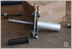 Après quoi il faudra percer le bloc en son centre au diamètre 10 ou 9.5mm, selon les tolérances/spécificités de votre projet/ressort. Calculez bien la profondeur de perçage, il sera plus dur de faire une reprise une fois la pièce tournée. Sur l’outil que j’ai fabriqué, l’axe est diamètre de ce perçage, ce qui évitera un jeu latéral pendant la rotation. Enfilez votre bloc d’alu sur le support, mettez tout ça dans le mandrin de la perceuse, démarrez la et usinez à la meuleuse dessus. Passez ensuite à la lime puis papier de ponçage et enfin laine de fer pour rectifier l’état de surface.