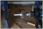 – Soit vous fabriquez un support spécifique. J’ai choisi cette option qui a l’avantage de permettre une meilleure tenue de la pièce pendant sa rotation. C’est la pièce que vous pouvez voir à gauche sur la photo ci-dessous. Un axe, un plat acier perpendiculaire et des supports pour mettre des vis de maintien.