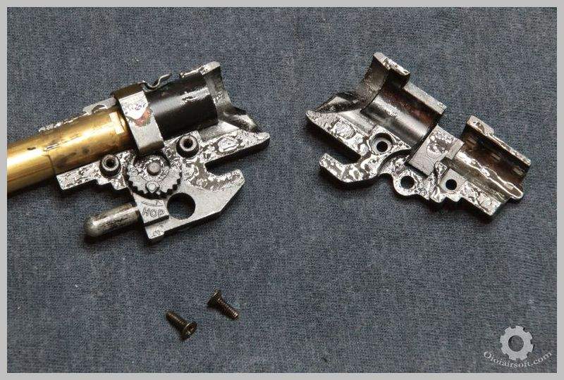 Le gras et plus particulièrement une huile sur un GBB a pour vocation de faciliter le mouvement des pièces en limitant la friction et ainsi de limiter l’usure par la même occasion. Ici point besoin de tout ça entre les 2 coques du bloc hop-up et encore moins sur le joint, le canon et la goulotte qui permet de transférer la bille du chargeur au canon.
