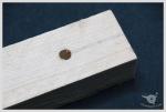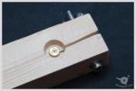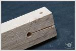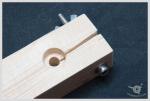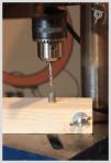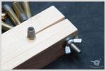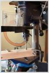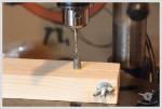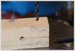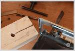 L’idée c’est donc de faire un support qui maintienne la douille bien verticale afin de la percer le plus droit possible pour ne pas déchirer le plastique. Un gros bout de bois percé au diamètre de la douille, une fente à la scie sauteuse et une longue vis pour serrer la douille dans son support.