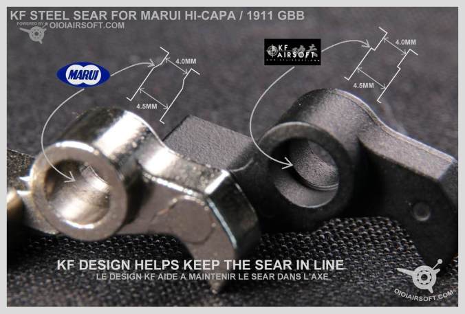 This upgrade part is manufactured by KF AIRSOFT, with steel and is designed to replace the stock sear of MARUI Hi-Capa GBB. It fits 1911 replicas.