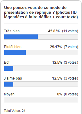 Ensuite, est ce que ça plaît ? Et bien heureusement, à 75% oui. 25% à qui ça ne plaît pas vraiment. C’est beaucoup. Mais tant pis, c’est ça ou le site risque de re-disparaître un jour. Donc les mécontents devraient pouvoir se satisfaire de pouvoir continuer à trouver leurs infos par ici plutôt que les voir disparaître dans les abysses de… de je sais pas. En tout cas de mon disque dur qui emporterait tout dans sa tombe.