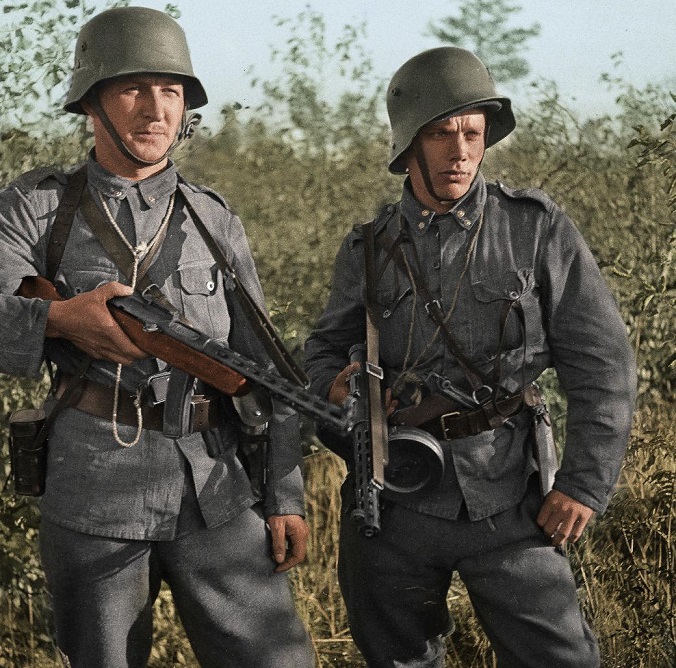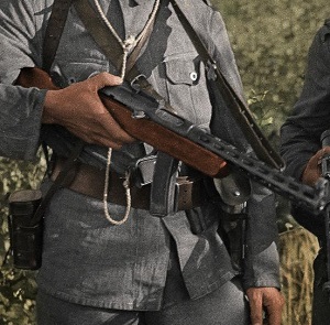 The PPD-34 (Pistolet-Pulemyot Degtyaryova) is a submachine gun originally designed in 1934 by Vasily Degtyaryov. The PPD had a conventional wooden stock, fired from an open bolt, and was capable of selective fire. The early PPD-34 was modified with a drum magazine, the PPD-38. And this 1938 version was simplified in 1940 for mass production with the PPD-40. It was replaced by the PPSh-41.
