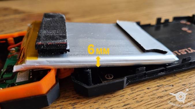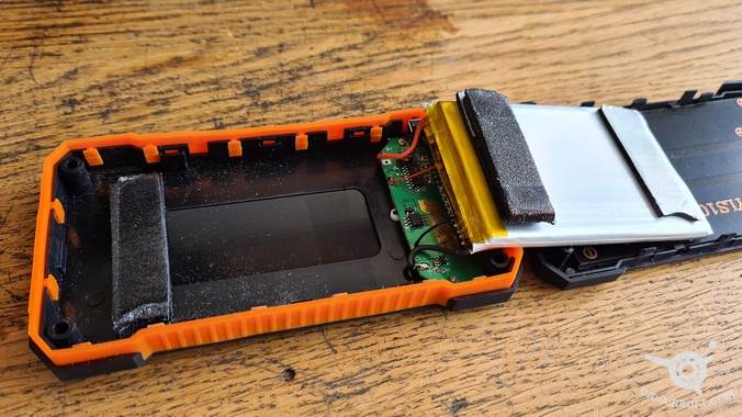 Mais il y a un – gros – détail qui ne passe pas inaperçu. L’épaisseur de la batterie. Toute fine, tellement que pour la fixer il y a une quantité invraisemblable de scotch double-face…