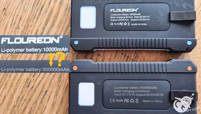 But! On closer inspection, there is something that is beginning to point more significant differences. The FLOUREON model indicates a capacity of 10,000 mAh when the out of service model has no brand and indicates 300,000 mAh of capacity.