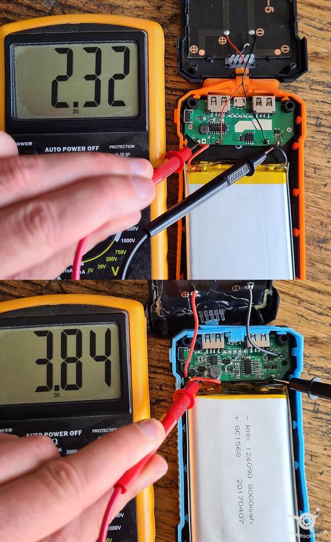 Essayons tout de même de diagnostiquer l’origine de la panne de la batterie orange… Mesurons le voltage aux bornes des deux batteries :