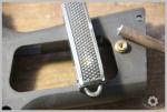 Je suis donc parti d’une chute d’acier, une tôle de 2mm récupérée dans une poubelle. Découpe à la meuleuse après traçage des angles ultérieurs. Par la suite il faut plier pour réaliser les “lèvres” du système de fixation. Une fois découpé, j’ai essayé de tordre directement à l’étau mais 2mm c’est déjà trop pour faire une pliure propre et bien droite avec les moyens du bord. J’ai donc réalisé une rainure à la meuleuse à l’endroit de la pliure afin de guider celle-ci. Remis dans l’étau et on tape au marteau sur un bout de bois qui va répartir de manière homogène le choc et permettre de plier partout de la même façon. Une fois plié à 90°, il faut réduire la longueur de la pièce de manière à ce que les lèvres ne fassent plus qu’un ou deux millimètres, selon la profondeur des rainures que vous envisagez de réaliser sur votre main spring housing.