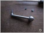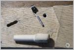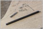 À partir d’un rond en acier, tourné sur ma perceuse (je n’avais pas encore reçu mon tour à métaux à l’époque du bricolage) le picot est réalisé. Il a le diamètre du trou de la crosse qui l’accueille, son arrière a un plus faible diamètre qui permet d’y maintenir l’extrémité du ressort qui le poussera. Il est également percé et taraudé pour accueillir une vis qui permettra de le mobiliser à la main de l’extérieur. Cette vis effectuera une translation permettant de reculer le picot pour monter le Colt, une fois relâché, le picot viendra grâce au ressort verrouiller la réplique en place. Il faut donc usiner une fenêtre des deux côtés de la crosse. Dans le bois et dans chacune des deux lèvres en acier : perçage, dremel, limage…