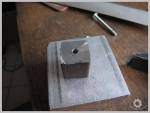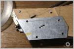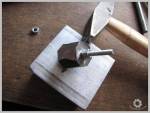 À partir d’un plat acier, perçage en plusieurs points pour le passage des vis de fixation et pliage au marteau pour épouser l’angle de la crosse. Jusqu’à ce que… ben l’acier se déchire au pli. Ça tient mais ça sera pas durable alors je préfère finir de “déchirer” le métal (musclor!) histoire d’avoir une base saine, ça change juste un peu le plan puisque seule partie avant sera métallisée.