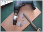 Bah… de la découpe à la scie, de la râpe à bois, papier de verre, insertion de la cheville de camouflage de l’orifice de passage du picot. Puis teinture à bois.