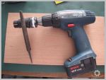J’utilise une visseuse électrique à batterie que je maintien fixe avec une main pendant que je lime la pièce métallique fixée dessus. Comme vous pouvez le voir