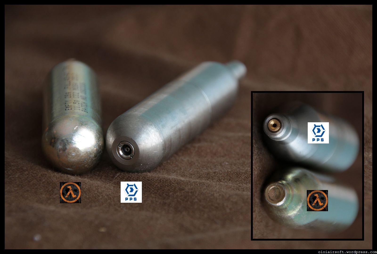 NB3 :When you have leakage problems on a CO2 magazine you become nervousness and waste capsule(s). Unless you own gas cartridges as in the photo below showing a lambda CO2 cartridge and a gas cartridge produced by PPS. (Caution wink in the picture)