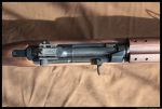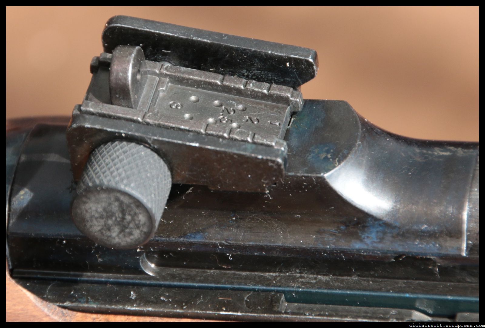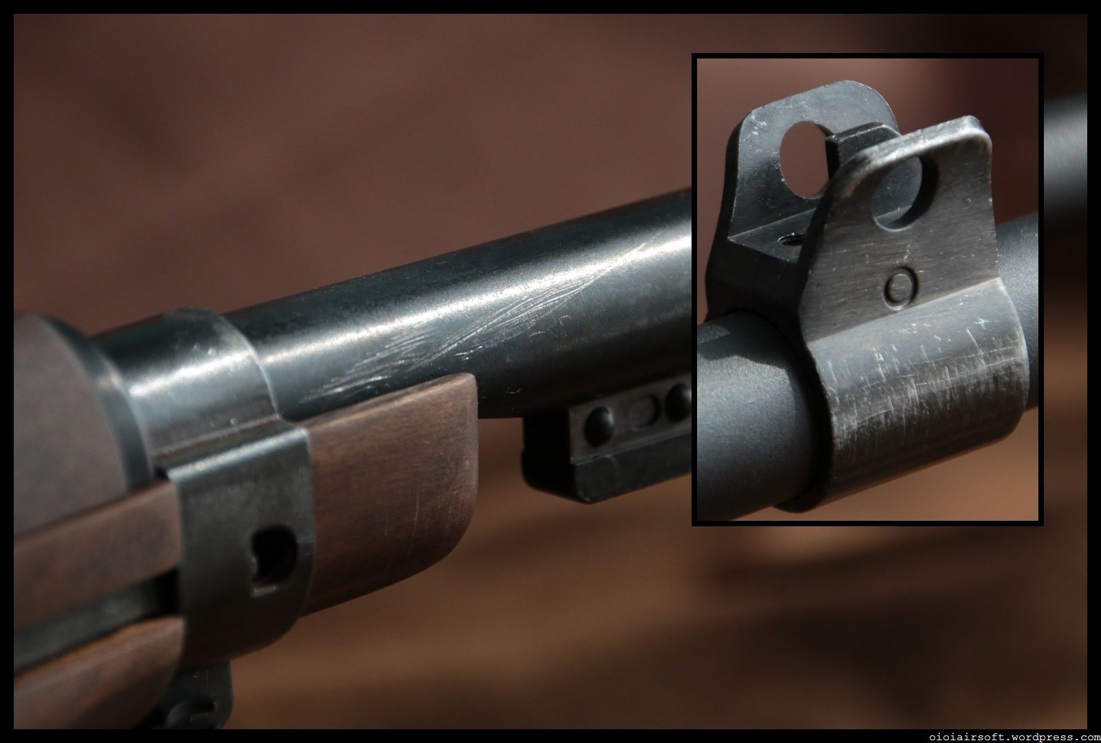 King Arms preferred to reproduce the second version of the rifle, with sights similar to those of its big brother, the M1 Garand ; aiming through an eyepiece, adjustable horizontally and vertically, towards a fixed front sight protected by two lips. So if the bayonet lug was relatively absurd to replicate, for rear sight, their choice is defensible. Indeed – and I’m glad – having adjustable sights is a serious plus, who has never had a replica (hand guns essentially) with poorly calibrated fixed sights and therefore not usable comfortably.