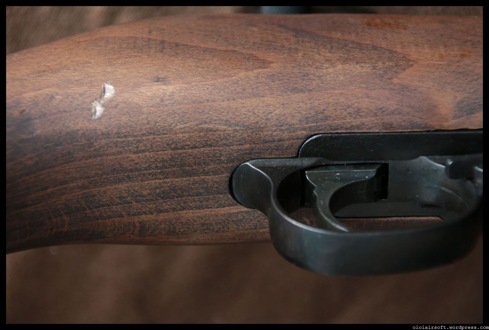 The mag who wanders out of its housing. And as the box is designed to receive the para model also, there is a vacuum and the mag had a lot of opportunities to move and unfortunately to damage the wood … Who the shop or manufacturer has not done its job properly? No idea but it’s enough to be edgy well considering the price of the gun, big hurts on the stock.